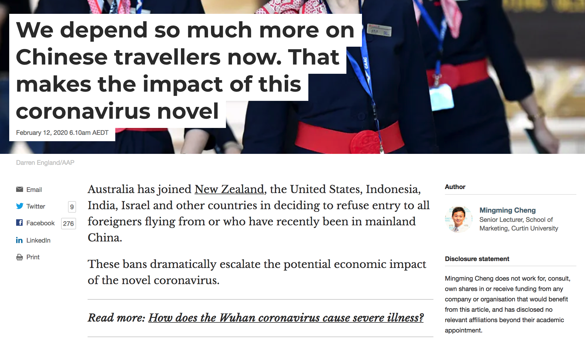 “We depend so much more on Chinese travellers now. That makes the impact of this coronavirus novel”. Theconversation.
